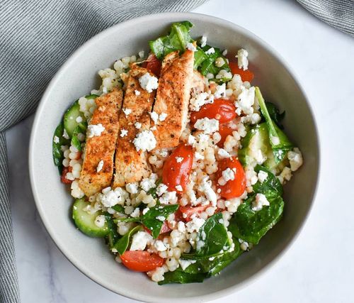 Perlinio kuskuso salotos su vištienaPerlinio kuskuso salotos su vištiena - gardžios, labai sočios salotos pietums ar vakarienei.