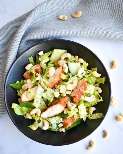 Žalios salotos su vištiena ir anakardžiaisŽalios salotos su vištiena ir anakardžiais - žalios, gaivios, traškios, sočios. Viskas ko tikimasi iš salotų.
